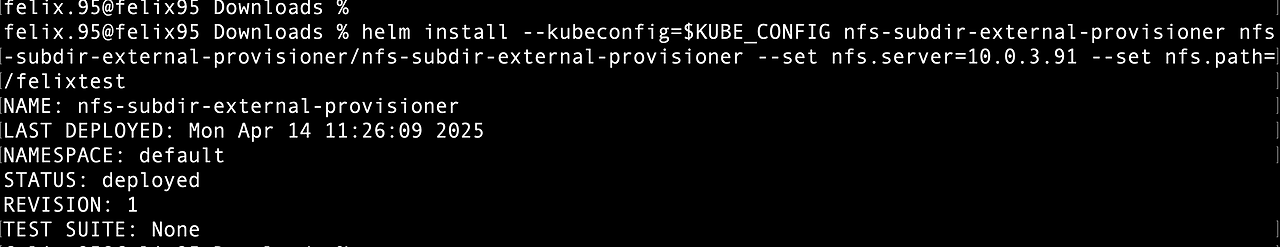 helm install --kubeconfig=$KUBE_CONFIG nfs-subdir-external-provisioner nfs-subdir-external-provisioner/nfs-subdir-external-provisioner --set nfs.server=[File Storage IP] --set nfs.path=[File Storage Mount Path]