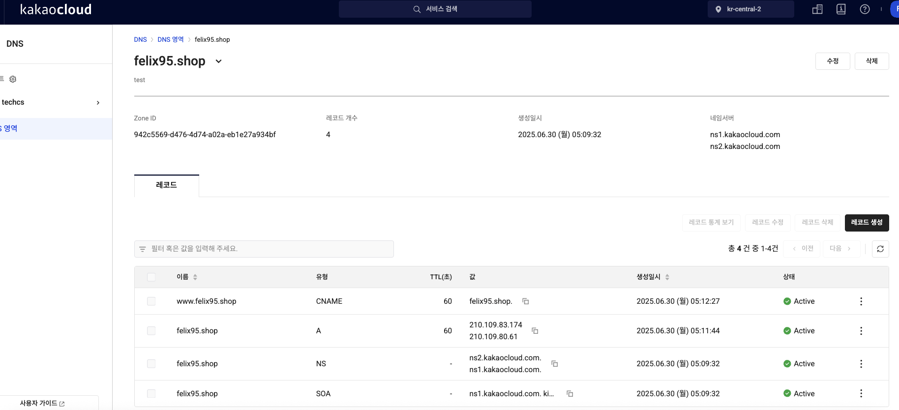 4. 카카오클라우드 DNS 설정을 통해 A레코드 CNAME 설정 및 정상 접속 테스트를 진행한다.
